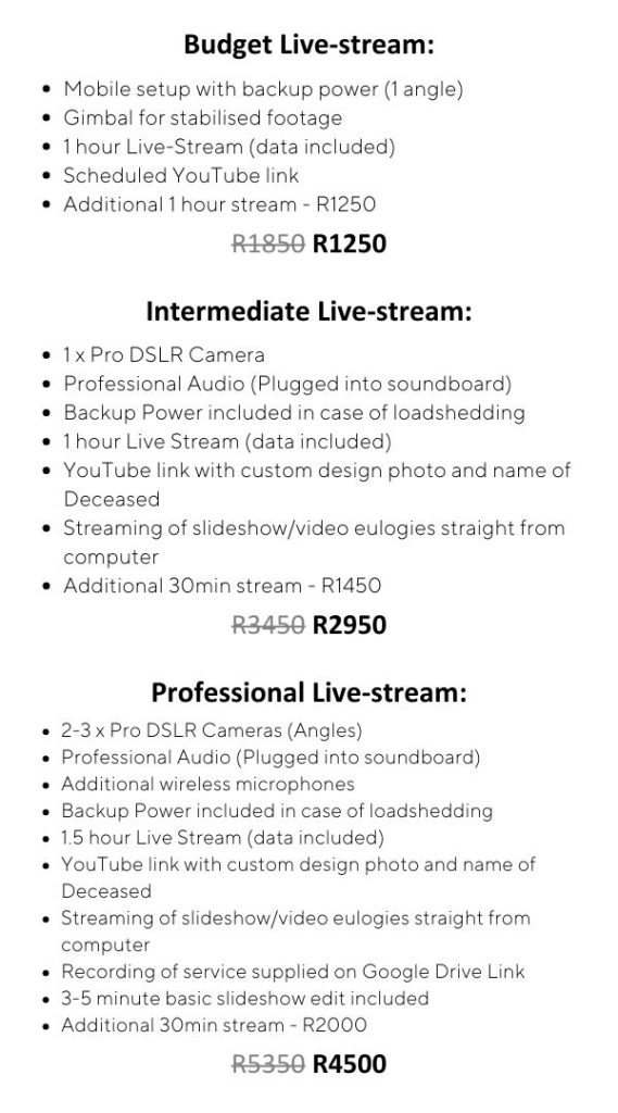 Whether it’s a wedding ceremony, a corporate event, or a heartfelt funeral service, we are dedicated to delivering seamless live streaming experiences. Our commitment extends beyond the ordinary, with backup power solutions to tackle issues like load shedding, ensuring that your event remains uninterrupted. Join us in embracing the future of live streaming – where distance is no barrier and every moment is shared. Elevate your events with 3-Axis Studios, where every second matters!
